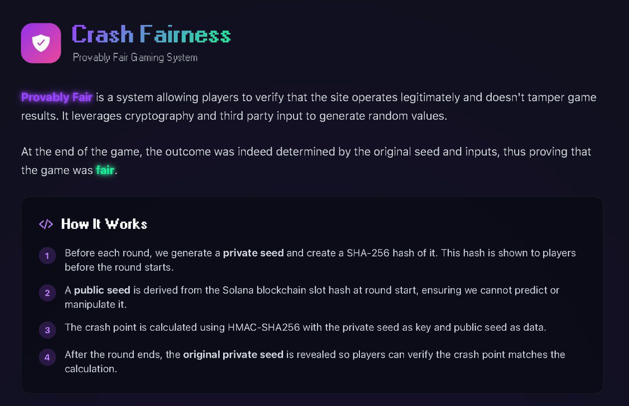 We designed the branding and UI/UX, built a fairness system where every round is independently verifiable by players, and delivered the live application. Players can check that outcomes weren’t tampered with after each round.